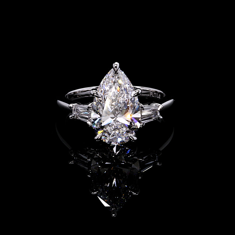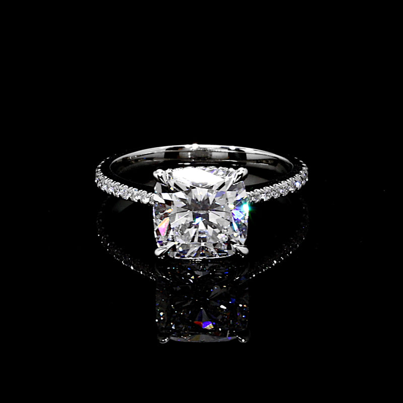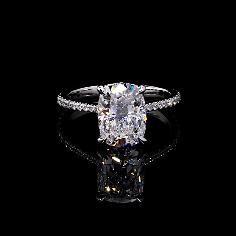 Looking for a ring that embodies timeless beauty? Consider the Audrey Pear Solitaire Lab Diamond Engagement Ring. This engagement ring showcases a 2.00 ct. pear lab diamond center stone, set in our signature pavé setting. For the partner who craves a unique and fluid design, explore the Elle Cushion Three Stone Lab Diamond Engagement Ring. This stunner is distinctively crafted with a 5.01 ct. cushion cut lab diamond center stone and matched-set of cushion stones side stones. This ring is seamlessly held in an exclusive double-prong setting with a dual-row high-polished band that perfectly exudes “Elle.”