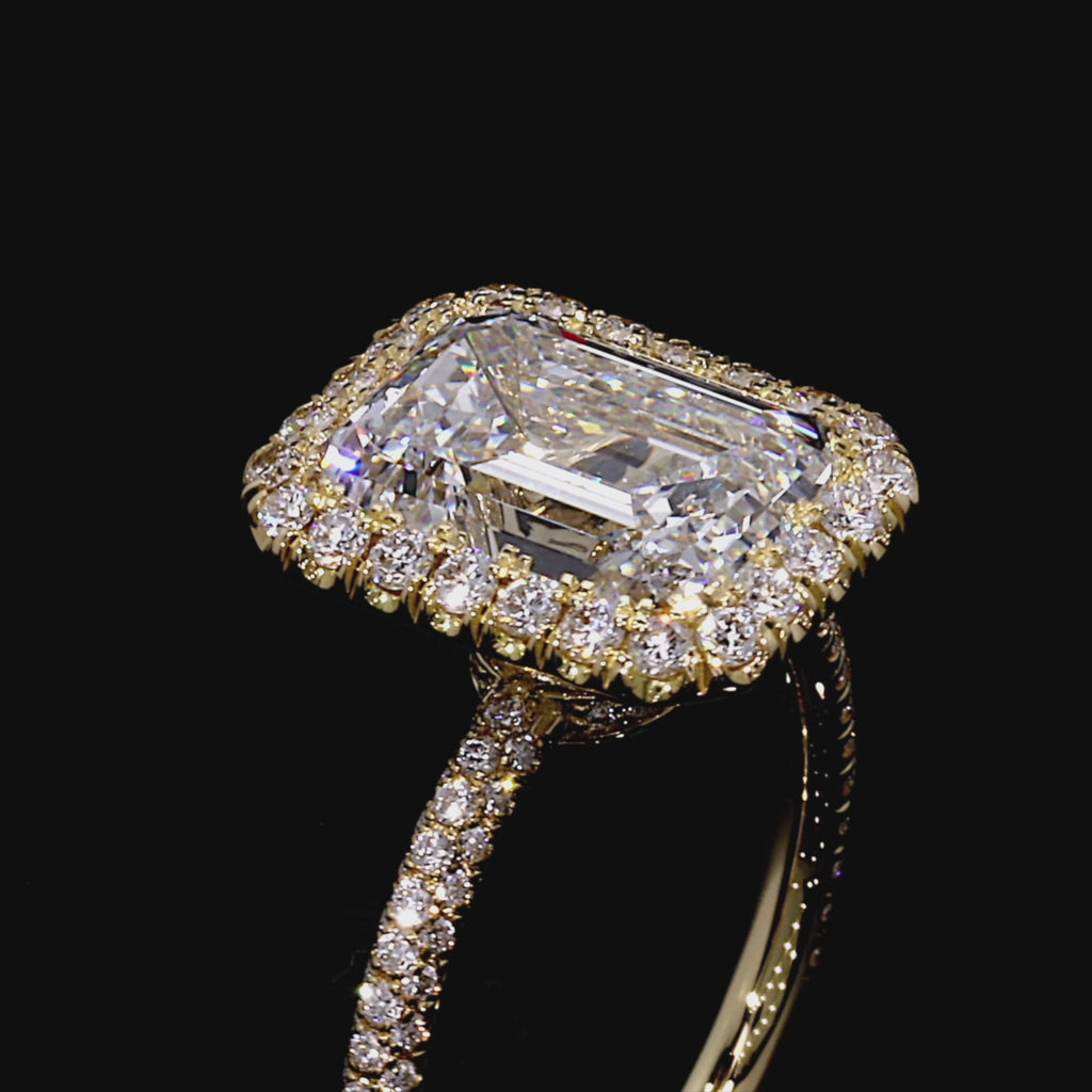 Alyssa’s halo square engagement rings feature Jean Dousset’s exclusive Seamless Halo® setting—a prongless design that surrounds the center stone from both above and below. This double-sided halo enhances symmetry, reveals the full crown and depth of the lab-grown diamond, and creates uninterrupted brilliance from every angle.
